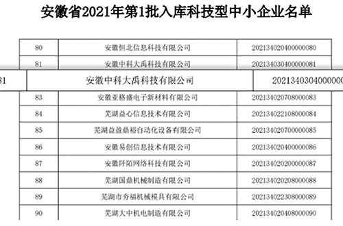 • 入選安徽省2021年第一批入庫科技型中小企業